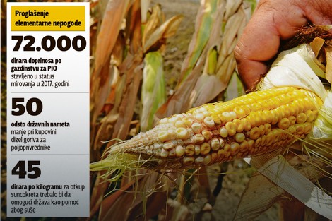 Proglašenje elementarne nepogode ratarima bi obezbedilo izvesne olakšice, a oni smatraju da bi pomoć trebalo da se ogleda u sledećem – da država otpiše sva nametnuta dugovanja po osnovu doprinosa za odvodnjavanje, da se PIO doprinos od 72.000 dinara po gazdinstvu stavi u status mirovanja u 2017. godini, da se dizel gorivo za poljoprivrednike oslobodi za 50 odsto državnih nameta, te da država omogući da otkupna cena suncokreta bude 45 dinara kilogram.
