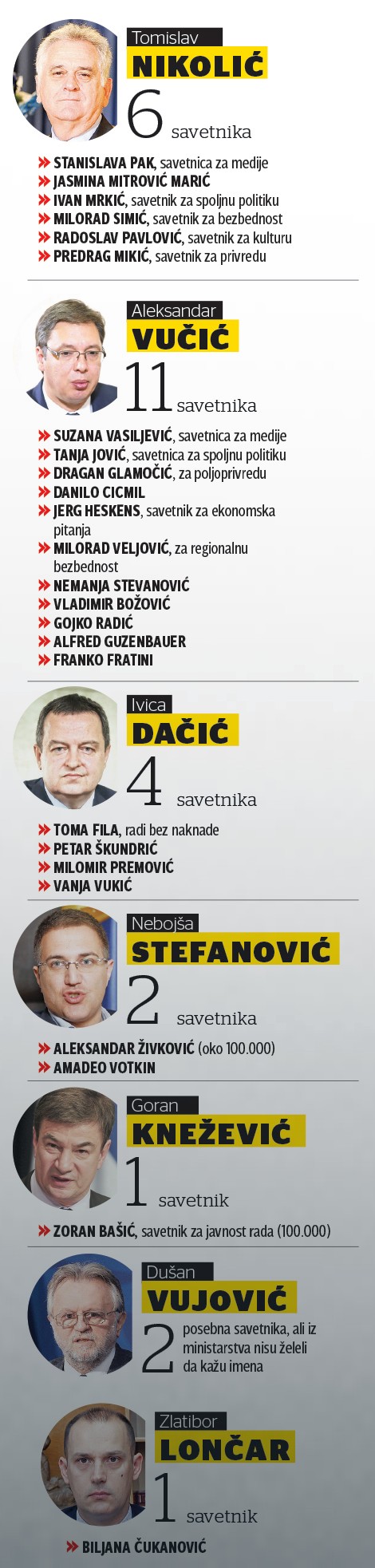 Svaki ministar po zakonu ima pravo da angažuje do tri posebna ili specijalna savetnika. Za razliku od mlađeg savetnika, savetnika, samostalnog ili višeg savetnika koji moraju da ispune određene uslove kada je reč o školskoj spremi i radnom iskustvu, posebne savetnike imenuju ministri i oni ne moraju da ispunjavaju nikakve uslove, osim da neki od ministara smatra da su mu njegove savetodavne usluge potrebne. (Blic)